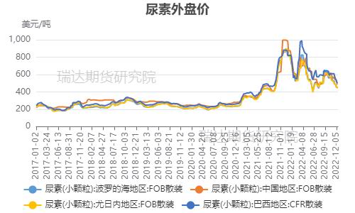 欧盟的能源危机有所缓和,国际尿素市场供应相对充足,但主要消费地需求表现仍弱,国际尿素价格持续回落。同花顺数据显示,截止2022年12月15日,FOB波罗的海现货价格在447.5元/吨,较上年同期下跌48.86;FOB中国现货价格在485美元/吨,较上年同期下跌50.76%;CFR巴西现货价格在502.5美元/吨,较上年同期下跌42.57%。国际尿素价格回落,但仍大幅高于国内,随着北半球2023年春季农需旺季的临近,欧美的需求将缓慢回升,届时刚需支撑下国际尿素价格重心有望逐步上移。