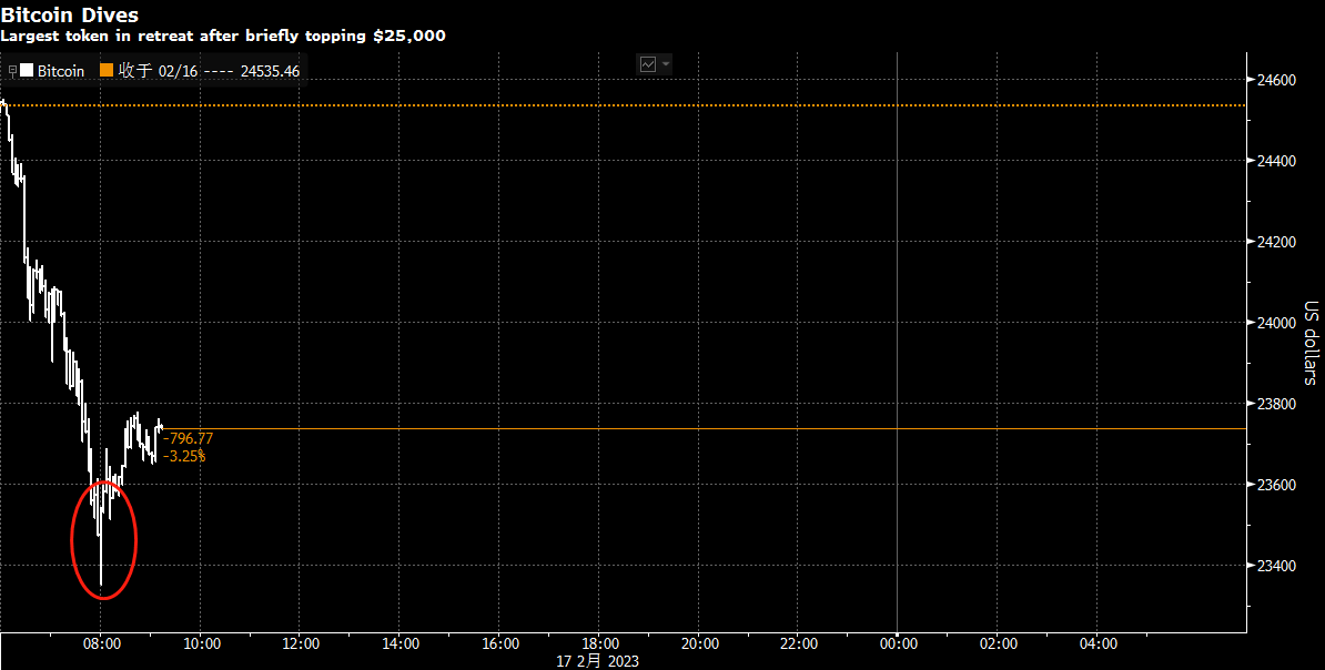 比特币创下约一周来最大跌幅,因美联储官员的鹰派言辞以及美国监管部门的进一步打击迹象进一步蔓延。比特币一度下跌4.2%,并跌破24000美元。以太币、Polkadot和Avalanche等较小代币也回落。美国证券交易委员会(SEC)在最新监管行动中起诉了TerraUSD背后的公司。TerraUSD曾是稳定币,去年崩跌引发行业危机和一系列引发高度关注的破产事件。与此同时,两位美联储最鹰派的决策者表示,他们可能青睐未来再度以更大幅度加息。这些言论削弱了全球市场的风险偏好,推高了美国国债收益率。