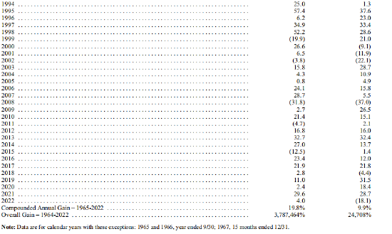 依照惯例,2023年的股东信开始还是伯克希尔的业绩与美股风向标:标普500指数表现的对比,2022年伯克希尔每股市值的增幅大幅跑赢标普500指数22.1个百分点。长期来看,1965-2022年,伯克希尔每股市值的复合年增长率为19.8%,明显超过标普500指数的9.5%,而1964-2022年伯克希尔的市值增长率是令人吃惊的3,787,464%,也就是37874倍多,而标普500指数为 24,708%,即超过247倍。