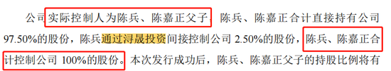 这是一家典型的家族企业,文依电气实际控制人为陈兵、陈嘉正父子,陈兵、陈嘉正合计直接持有公司97.50%的股份,陈兵通过浔晟投资间接控制公司2.50%的股份,陈兵、陈嘉正合计控制公司100%的股份。