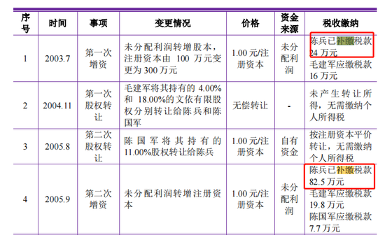 招股书还显示,文依电气历史股权变动中,存在相关税费未缴纳情况。其中,又涉及陈兵,陈兵已于2017年6月补缴其应缴纳的个人所得税税款106.5万元。