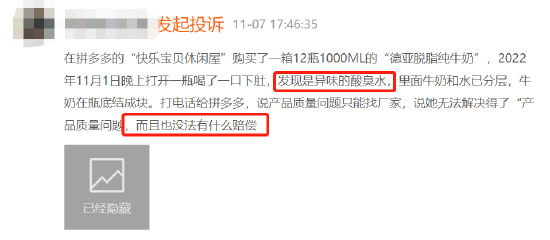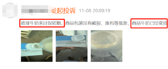 有消费者在黑猫投诉平台上反映称德亚牛奶在保质期内变质,味道变酸且牛奶在瓶底已经结成块状,该类问题并非个例。此外还有多名消费者投诉德亚牛奶拒不发货,强迫消费者退款。截至11月底,德亚牛奶在黑猫投诉平台上累计投诉196单,回复率不足5%。