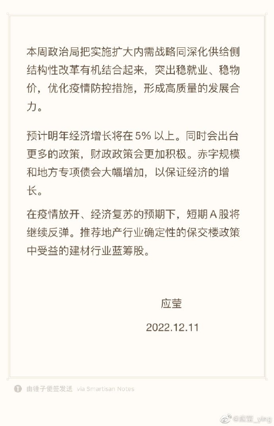 预计明年经济增长将在5%以上。同时会出台更多的政策,财政政策会更加积极。赤字规模和地方专项债会大幅增加,以保证经济的增长。