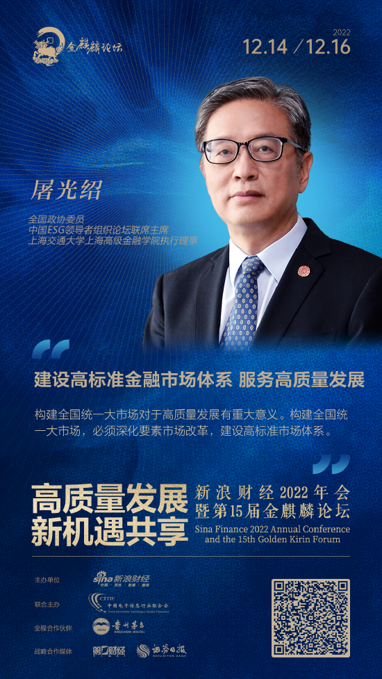 12月14日,全国政协委员、上海交通大学上海高级金融学院执行理事屠光绍教授在新浪财经2022年年会暨十五届金麒麟论坛上作《建设高标准金融市场体系,服务高质量发展》主题演讲,围绕高质量发展,详细探讨了金融市场体系建设和高质量发展之间的内在关系。