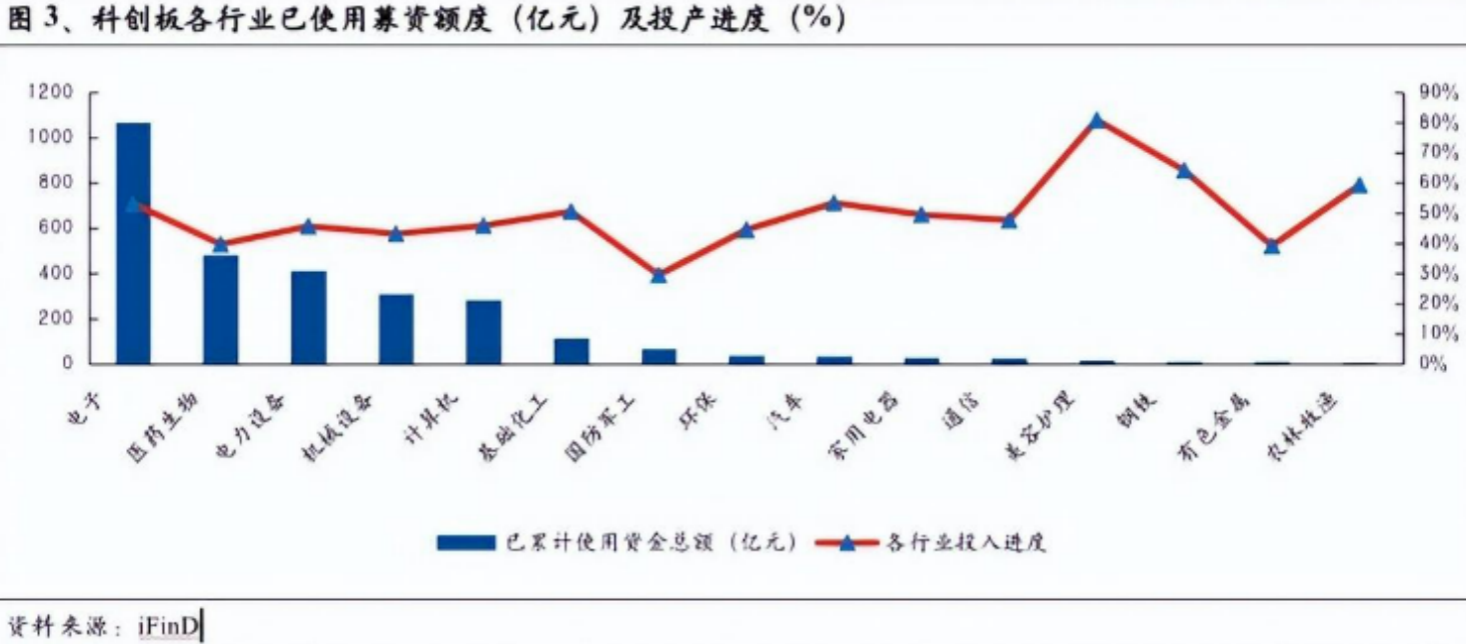 科创板整体募资投产进度较快。根据2022年科创板上市企业中报披露的募资使用情况,电子、医药生物、电力设备、机械设备、计算机行业已分别投入1068.79亿元、483.79亿元、414.91亿元、309.79亿元以及281.43亿元,分别占各行业募资金额的53.17%、39.66%、45.66%、43.15%以及45.85%,从科创板整体来看,各行业投产进度平均超过40%,投产进度较快。