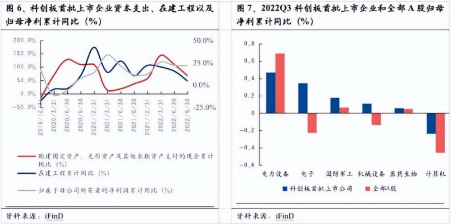 与全部A股相比,科创板首批上市企业2022Q3的业绩表现中,除了电力设备行业归母净利累计同比低于全部A股外,其他行业业绩增速均超过A股市场。整体上看,首批科创板上市企业归母净利累计平均超过全体A股15.35%,分结构来看,电子行业科创首批上市企业高于全体A股57.10%。机械设备行业全体A股2022Q3归母净利同比下降,而科创首批上市企业仍然保持了正值增长率,为11.07%。参照创业板业绩兑现轨迹,随着科创板投产进度不断推进,业绩有望迎来新一轮增长。