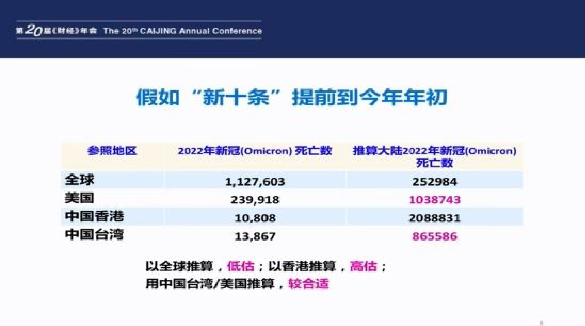 《财经》年会2023:预测与战略于2022年12月17日-18日在北京召开。中国疾病预防控制中心流行病学首席专家吴尊友表示,如果“新十条”提前到年初,中国大陆会多死亡86.6-103.9万人。